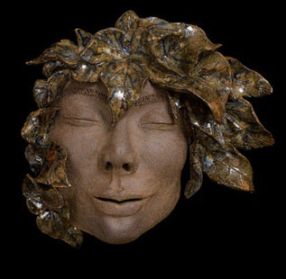 Each dream mask is about 3/4 life size. They are high fire glazed, with stains and low fire glaze added to some as an additional layer. As a third layer, a few have white and yellow gold and copper lusters applied. In addition, there may be elemental attachments such as glass beads, semi-precious stones, bones, seeds, pods, seashells, fossils, feathers, and other objects.